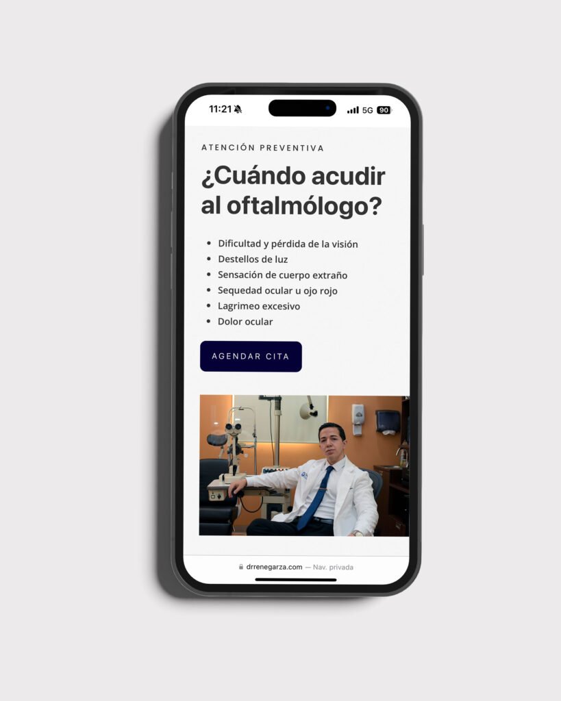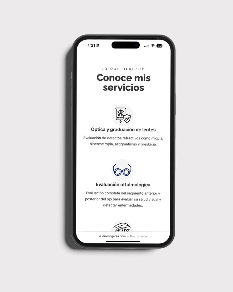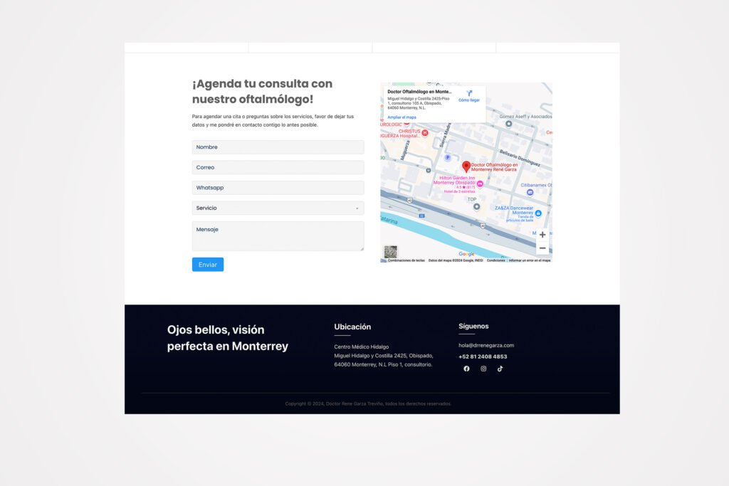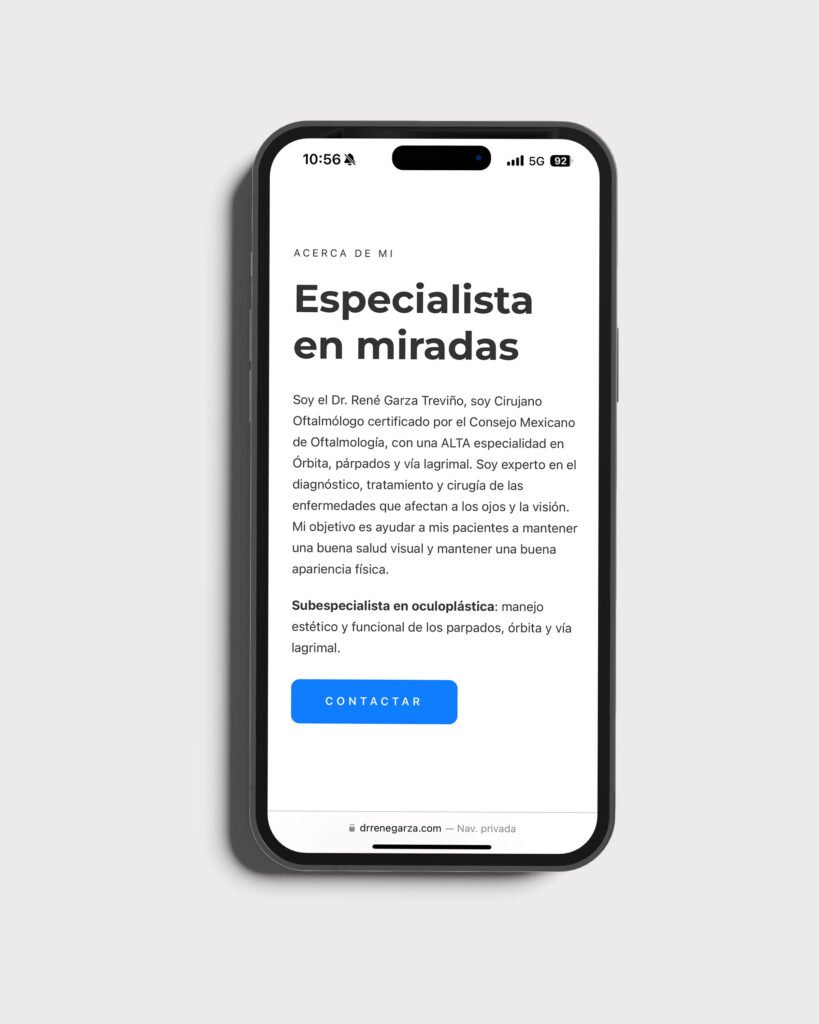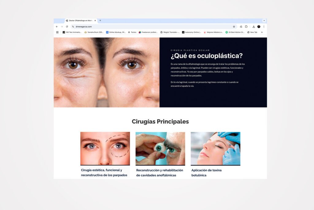 El proyecto del sitio web para el Dr. René Garza fue una oportunidad para reflejar su experiencia y compromiso con el cuidado de la salud visual. El objetivo fue diseñar una página clara y profesional que destacara sus servicios médicos y su especialización en oftalmología y oculoplástica.